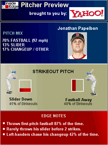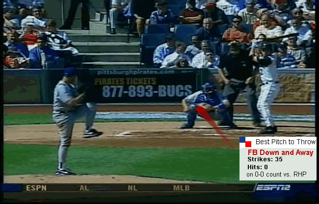 Graphic and text show the viewer what pitch the pitcher should throw to give himself the best chance of success - depending on the count and opposing batter.