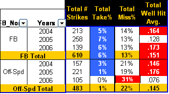 With 2 Strikes, Beltre has performed well with Fastballs, but he has struggled with NONFB’s, compared to 2004 and 2005. In particular, he is swinging and missing a lot more, and has hit only 8 of the 105 NONFB’s hard with 2 strikes |