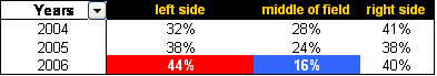 The graphic below shows how often Adrian hits an outside pitch to each side of the field. In his successful 2004 campaign, he drove the ball up the middle more, and less to the left side of the diamond: