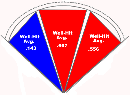 | Adrian proves the theory that it's better to go with outside pitches than to pull them. Below is a graphic that shows Beltre's Well-Hit Average on pitches Away from him that are put in play. Clearly, he is much better off using the whole field. |
